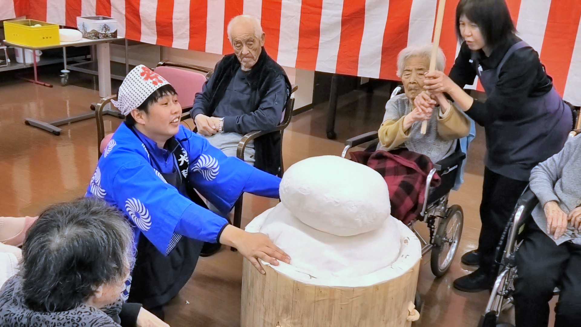 ・令和7年の大みそかに、大和の故郷でミニレク「餅つき大会」を行いました。毎日のレクリエーションの時間を大晦日と言うこともあり、グレードアップしました。通常の行事より短い時間でしたが、皆で楽しい時間を過ごしました。
